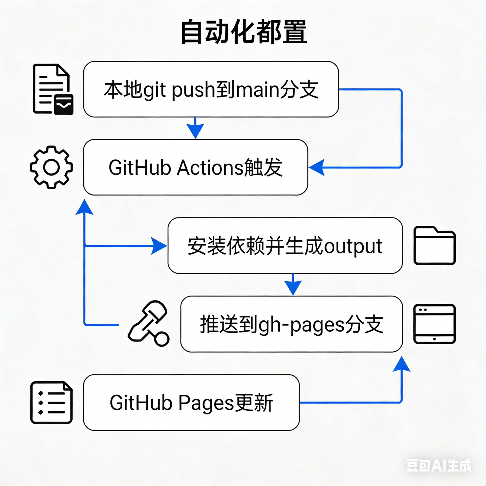- 无需手动切换到gh-pages分支修改文件,所有更新都通过main分支的推送自动触发;