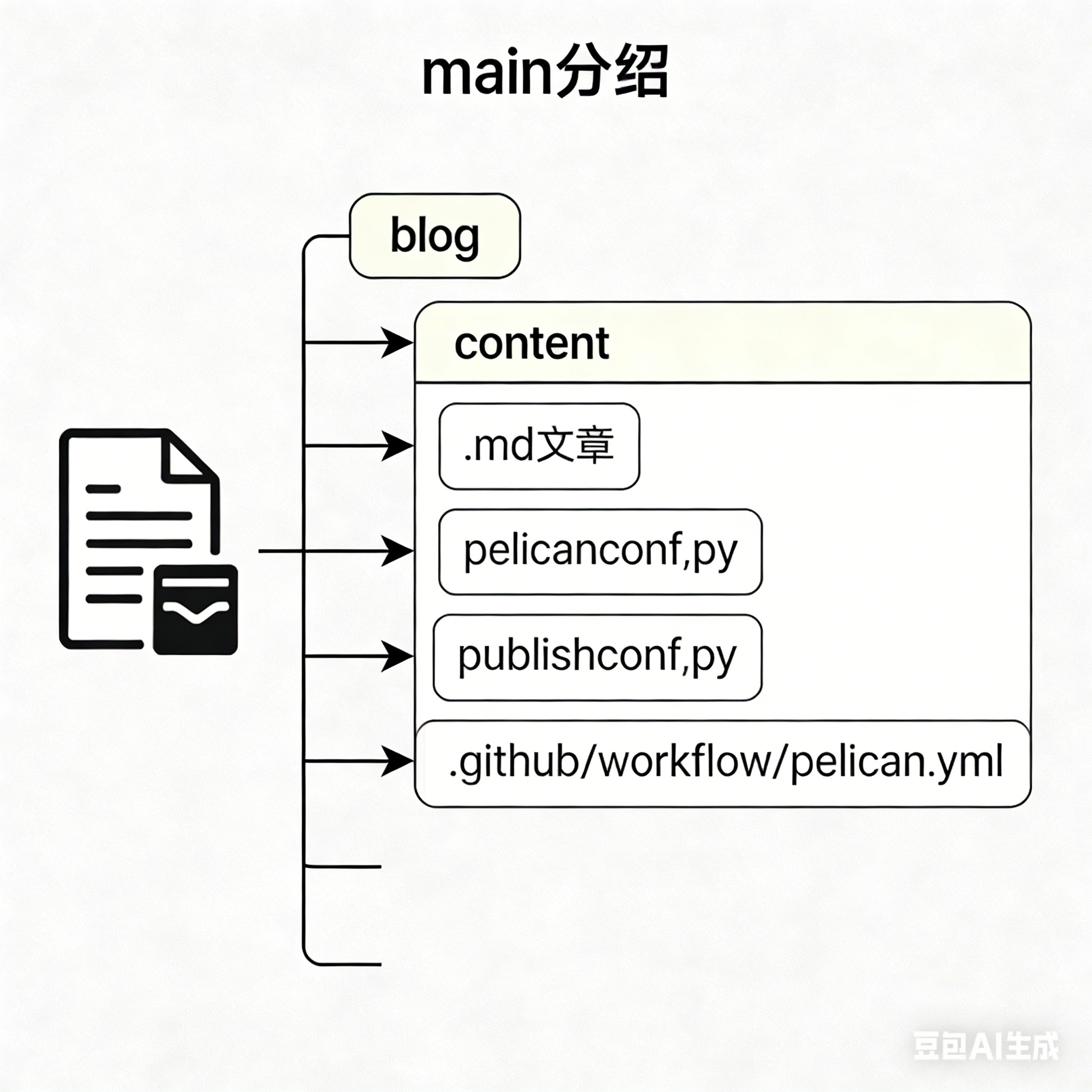 content目录下新建photos文件夹,将需要展示的图片(比如branch-intro.jpg、main-branch-files.jpg、auto-deploy-flow.jpg)复制到该目录(也可以根据不同需要新建子目录,例如根据博客名称新建"branch-deploy"):